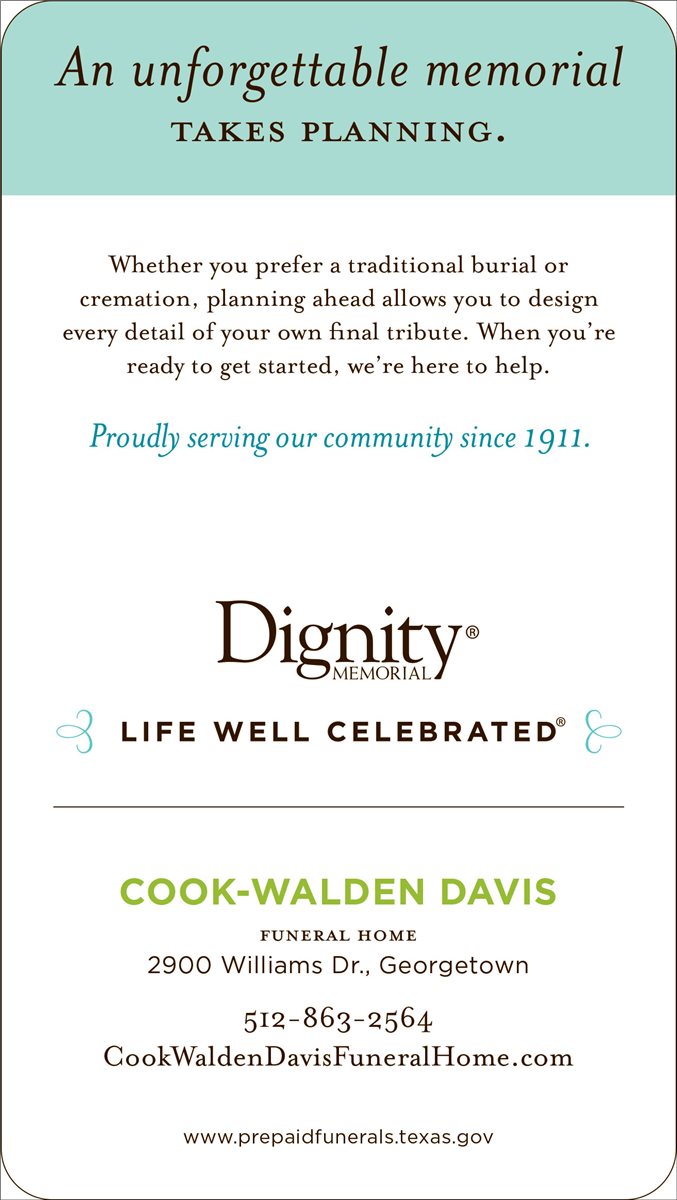 Each one of us is unique with our own story to tell. BBB accredited since 981989. Get reviews hours directions coupons and more for Cook-Walden Davis Funeral Home at 2900 Williams Dr Georgetown TX 78628.